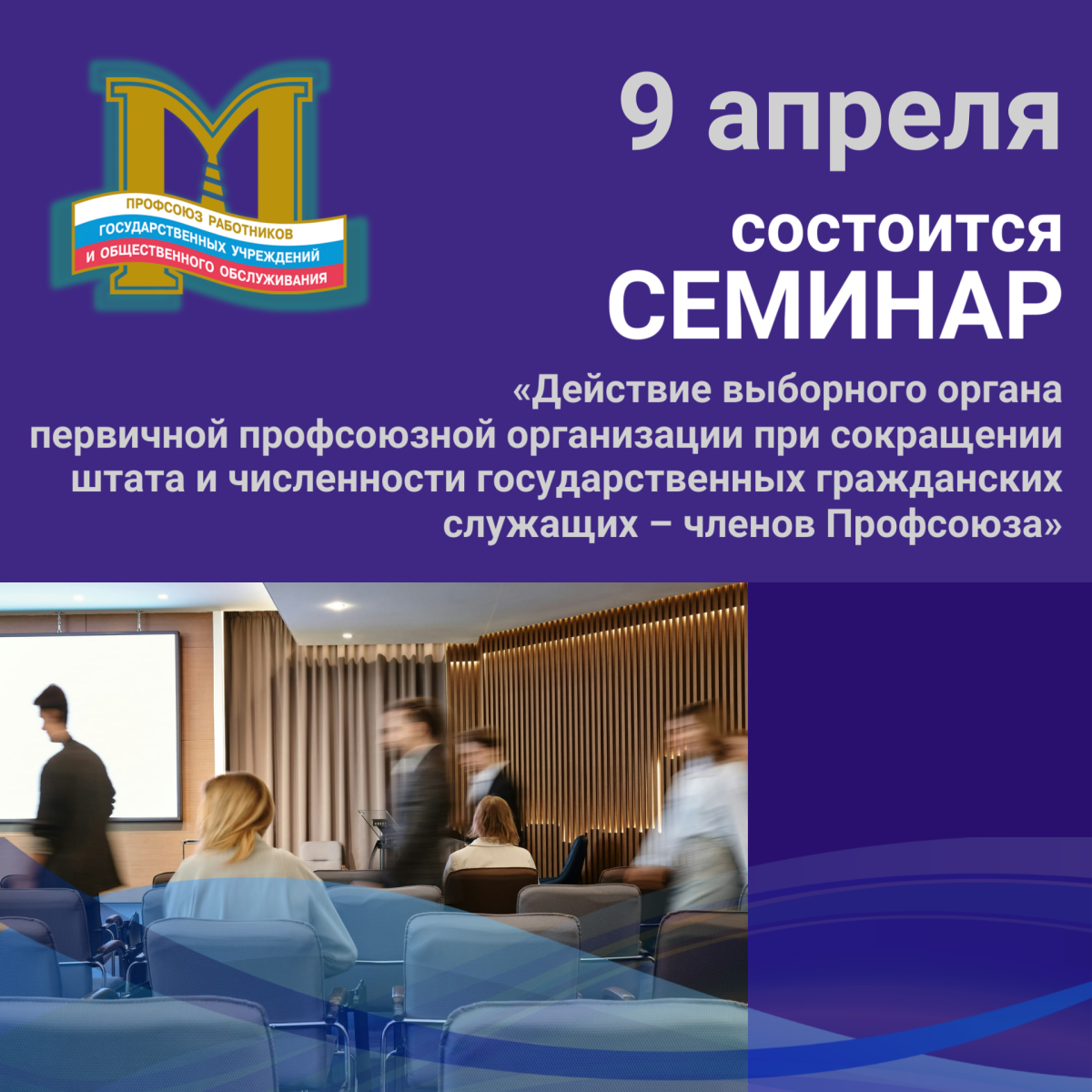 Аппарат комитета МГО Профсоюза работников госучреждений приглашает председателя первичной профсоюзной организации, представителей юридической и кадровой служб на семинар по теме: «Действие выборного органа первичной профсоюзной организации при сокращении штата и численности государственных гражданских служащих – членов Профсоюза», который состоится 9 апреля 2026 года в 15.00 по адресу: Москва, Гагаринский переулок, д.5, стр.1 (Большой зал - I этаж).